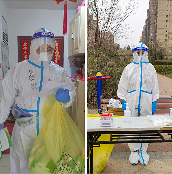 吉林司法警官职业学院招生就业处教师张俊鹏和东师附小语文老师杨蕾靖都是共产党员,二人主动请缨,共同扑到一线开展抗疫支援服务。他们先后前往居民楼发放试剂盒、“扫楼”登记、核对居民信息、关爱特殊人群等。遇到老年人不会自测的,他们就耐心帮助,完成检测。确保不少一户,不落一人。有些行动不方便的人员,他们也会多问几句有没有什么需求,尽量帮助。跑了几栋楼,张俊鹏的防护服已被汗水浸湿。“有时候我看他累得不行,就主动提出让他休息一会。”看到丈夫忙碌的身影,杨蕾靖有点心疼。为了不让家人担心,他们不敢向家人多说,有时候父母打电话过来,也只是随口应付几句:“我挺好的,蛮好,还行……”就匆匆挂断电话。他们是相互体贴的爱人,也是并肩作战的战友,他们用自己的实际行动诠释了共产党员的初心和使命,践行了志愿者的责任与担当!