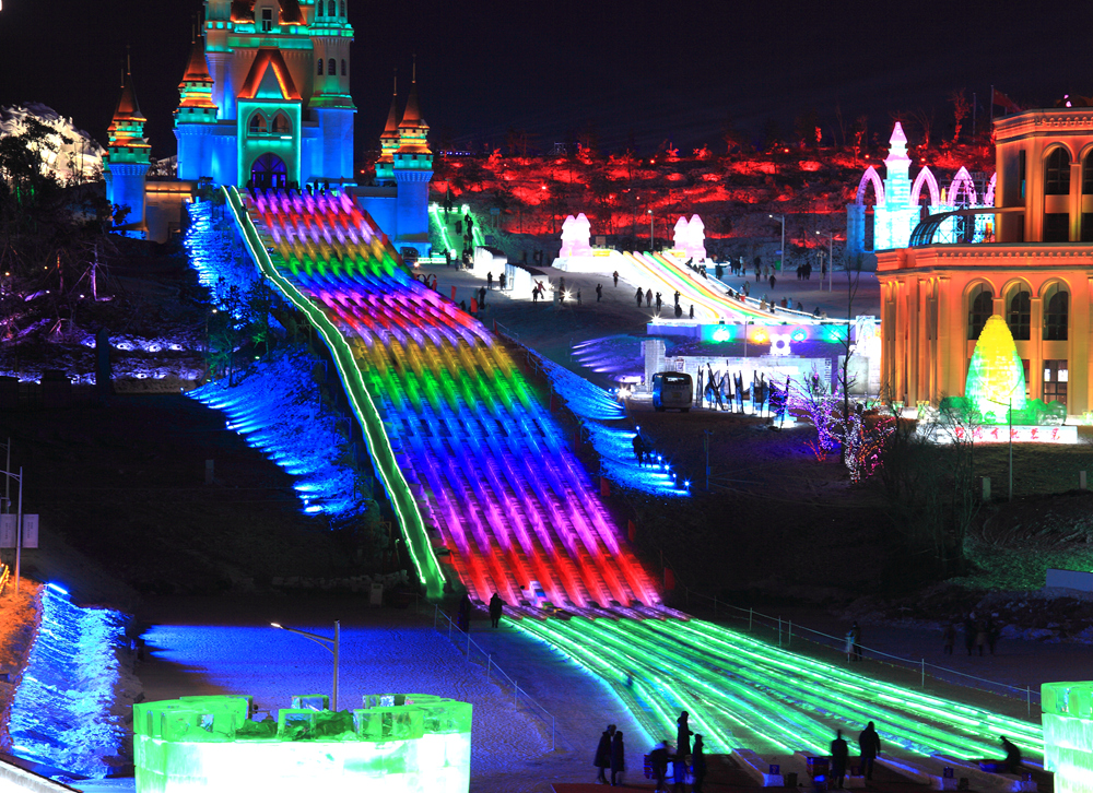 长春冰雪新天地依山傍水而建,景观错落有致,规模体量都堪称世界级的冰雪主题乐园。每个冰雪季,它都会通过提前储冰4万立方米,将全新的冰雪产品及时推向市场,成为全国最早点亮冰灯的地方。除了每年不同主题的冰、雪雕产品外,它还建造了水晶城堡、雪宫、婚礼殿堂等超过1万平方米的固定建筑。