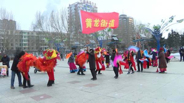 在龙府广场,黄龙街道秧歌队队员们身着鲜艳服装,变换着多种队形和花样,为农安人民送上节日祝福。
