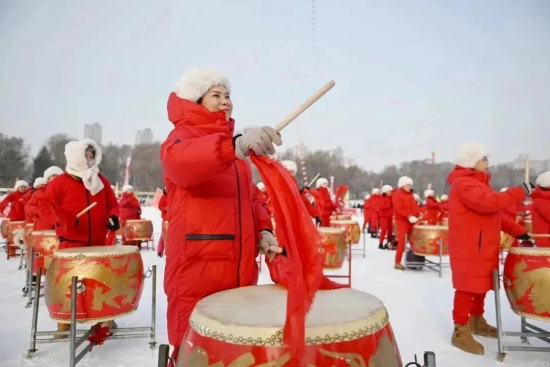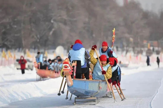 寒冰热血,龙舟竞渡,冰上龙舟项目赛场上一派火热景象。裁判员一声令下,一艘艘龙舟如离弦之箭冲出起点,伴随着阵阵鼓声和加油声越划越快。松原市代表队选手苏博文说,每条龙舟上的12名队员来自不同单位,通过这场赛会结缘相识,“我们不仅在冰天雪地里赛出了激情,更赛出了友谊!”