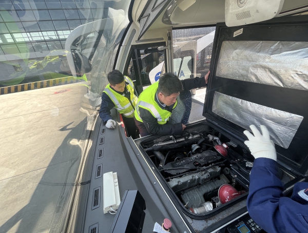 在现场检查过程中,为确保从根源上杜绝和防范安全隐患,切实加强车辆安全管理,检查小组对摆渡车、平台车、客梯车、传送带车、残疾人登机车、机组车等车辆的转向、制动、液压、电气系统进行了细致排查和性能测试,并结合即将开展的车辆换季保养工作,指派专人对电动车辆的电池、线缆、高压电等方面进行全面排查监测。